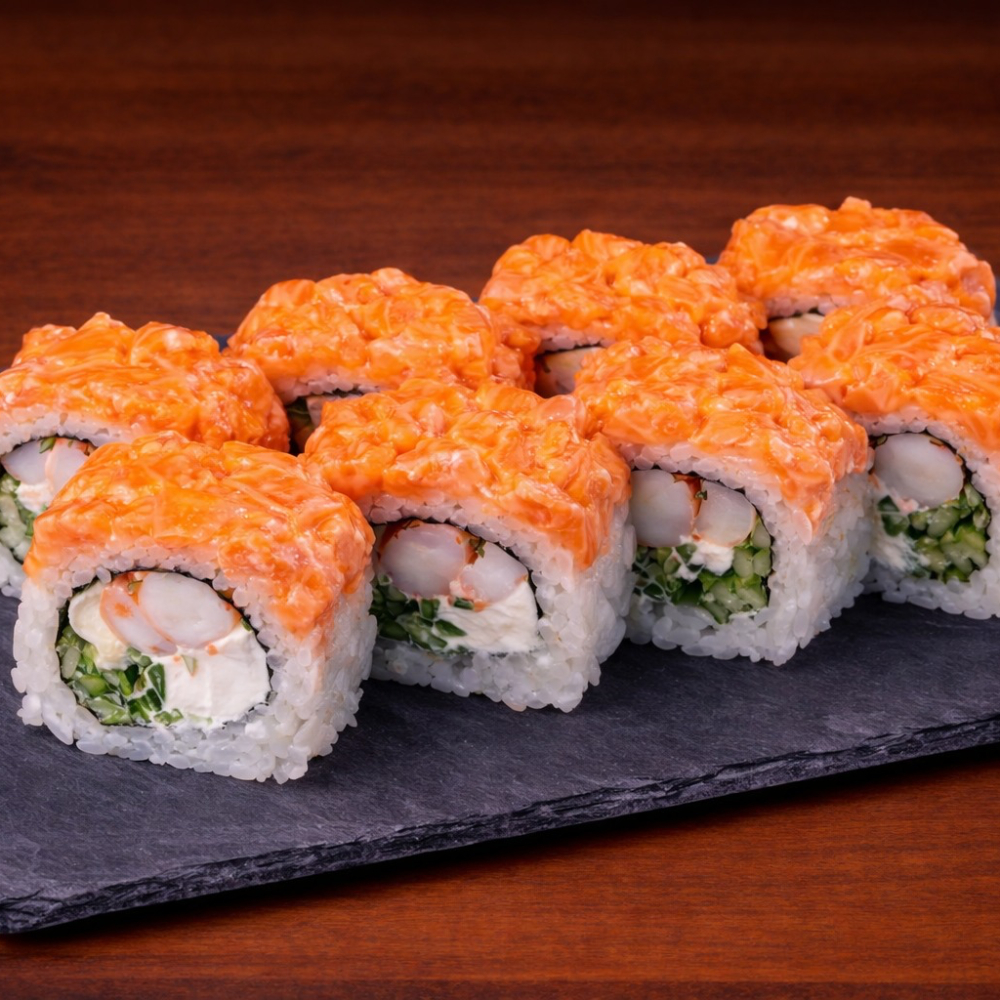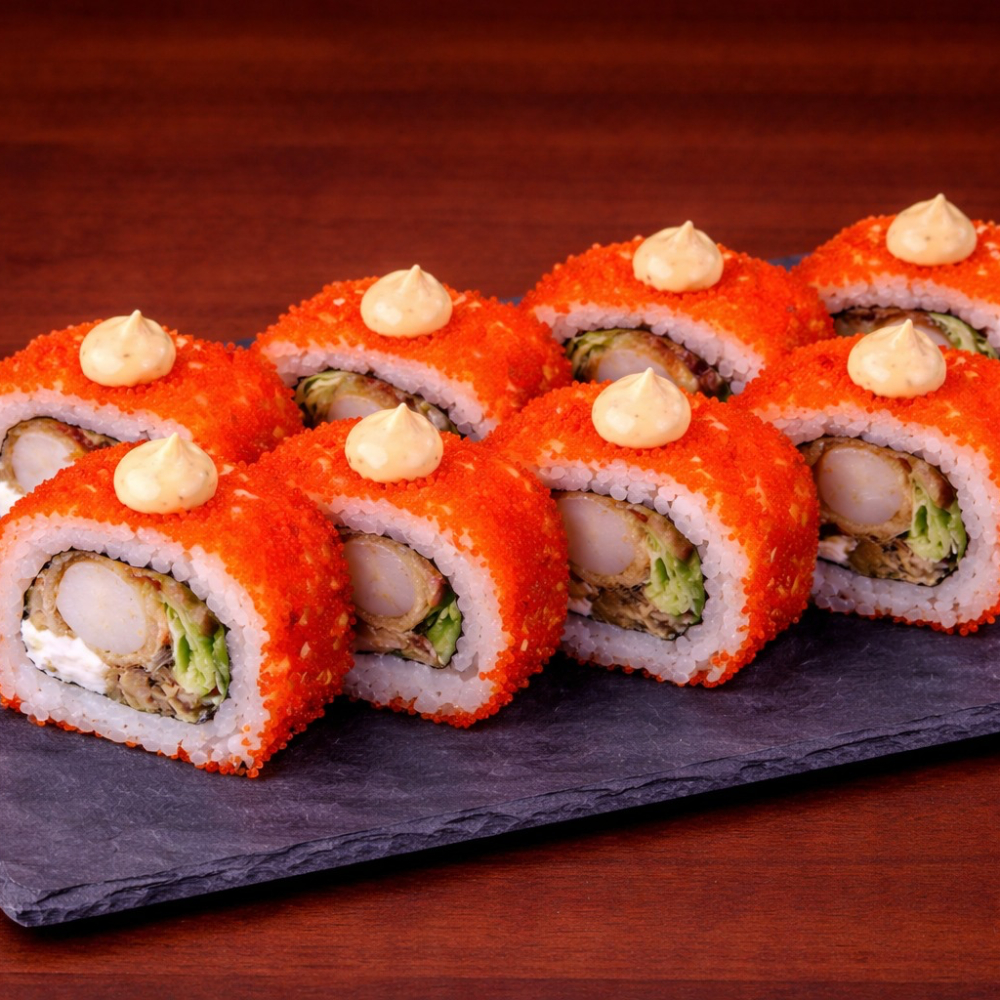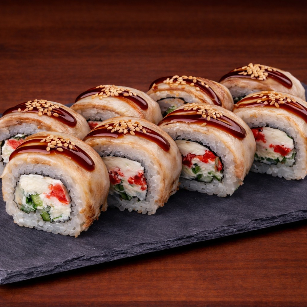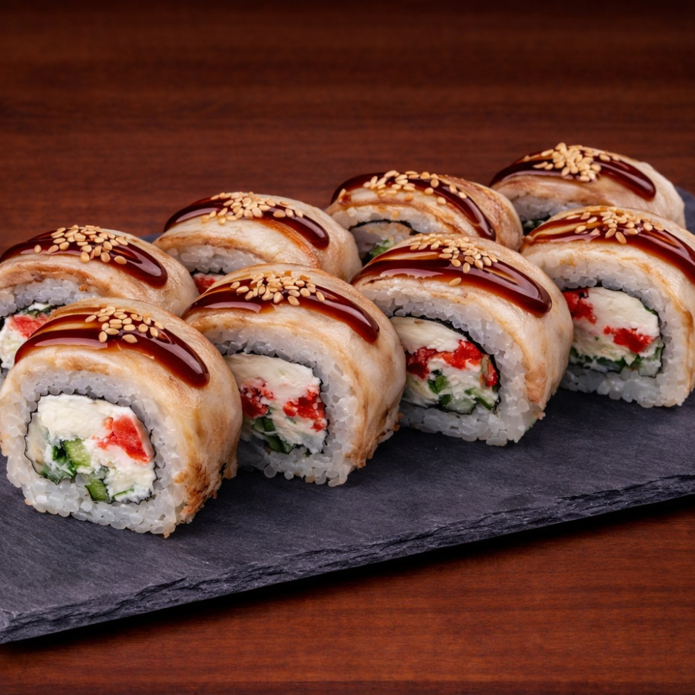 Ролл Королевский дракон с крабом — это изысканное сочетание нежного копчёного угря, краба сурими и кремового творожного сыра с хрустящим огурцом на плотном рисовом основании, обёрнутом нори. Сверху — икра масаго, ароматный соус унаги и соус яки, лёгкая посыпка кунжутом. Создаёт насыщенный, сбалансированный вкус с приятной сладко-солёной гармонией и богатой текстурой. Идеальный выбор для ценителей премиальных, многослойных роллов.