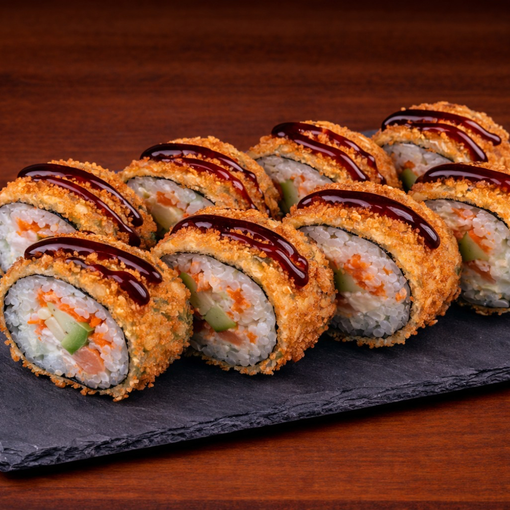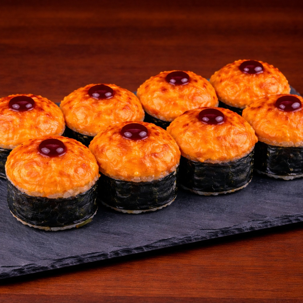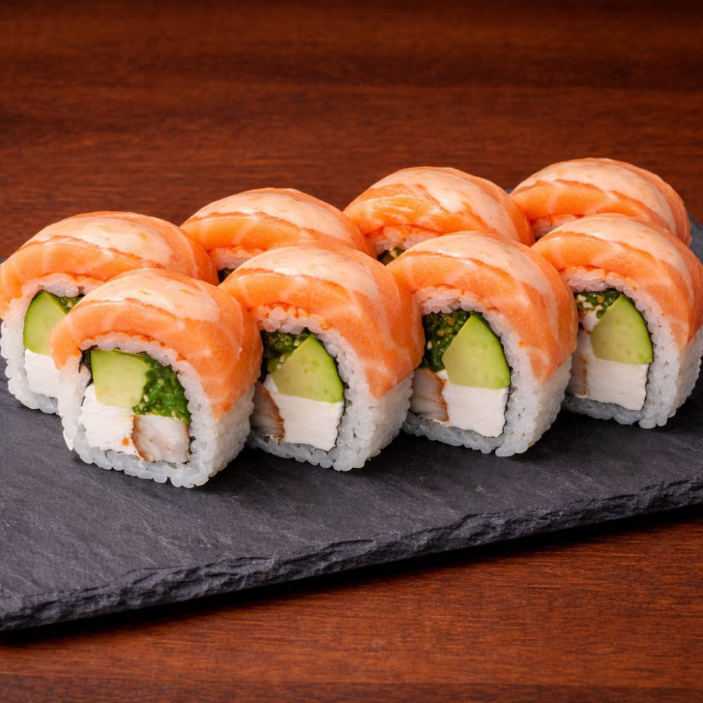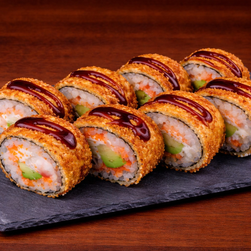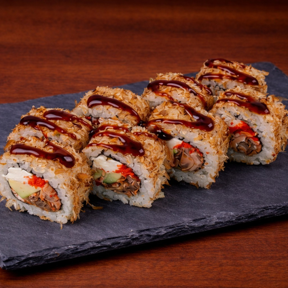 Ролл Королевский дракон с крабом — это изысканное сочетание нежного копчёного угря, краба сурими и кремового творожного сыра с хрустящим огурцом на плотном рисовом основании, обёрнутом нори. Сверху — икра масаго, ароматный соус унаги и соус яки, лёгкая посыпка кунжутом. Создаёт насыщенный, сбалансированный вкус с приятной сладко-солёной гармонией и богатой текстурой. Идеальный выбор для ценителей премиальных, многослойных роллов.