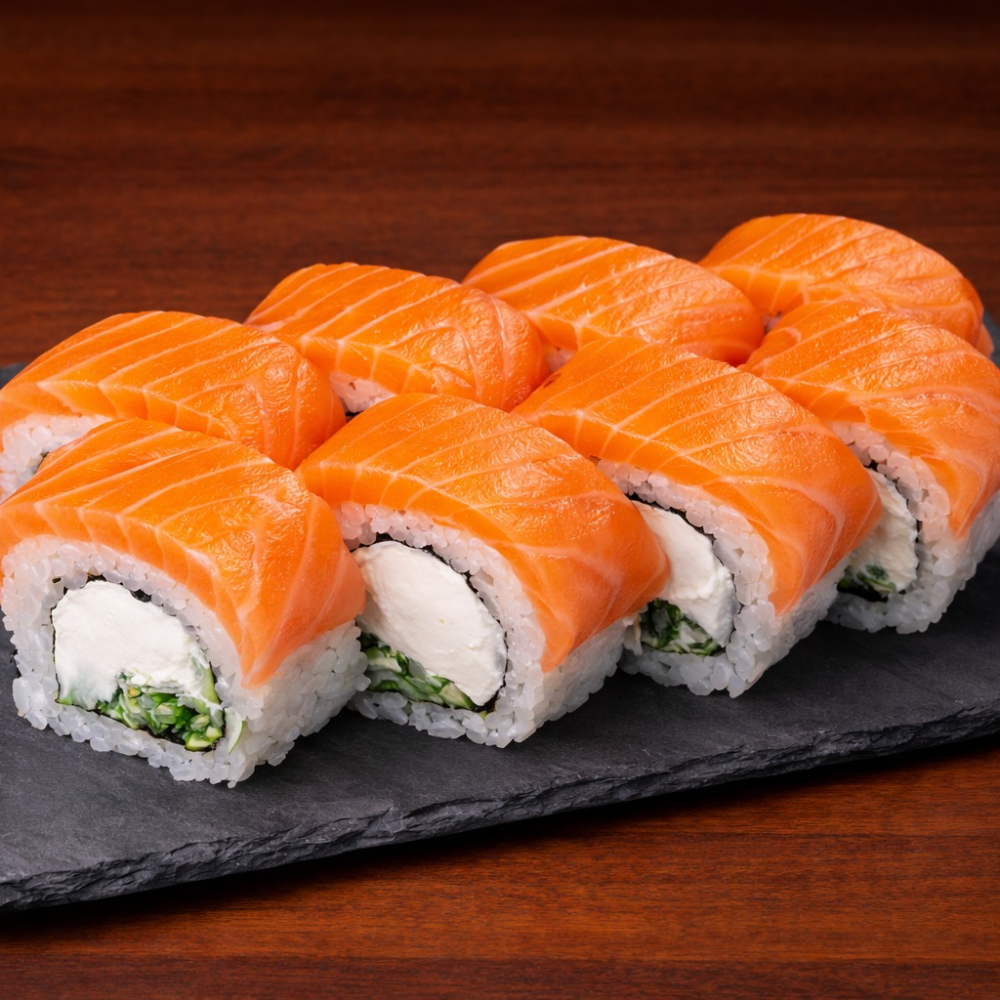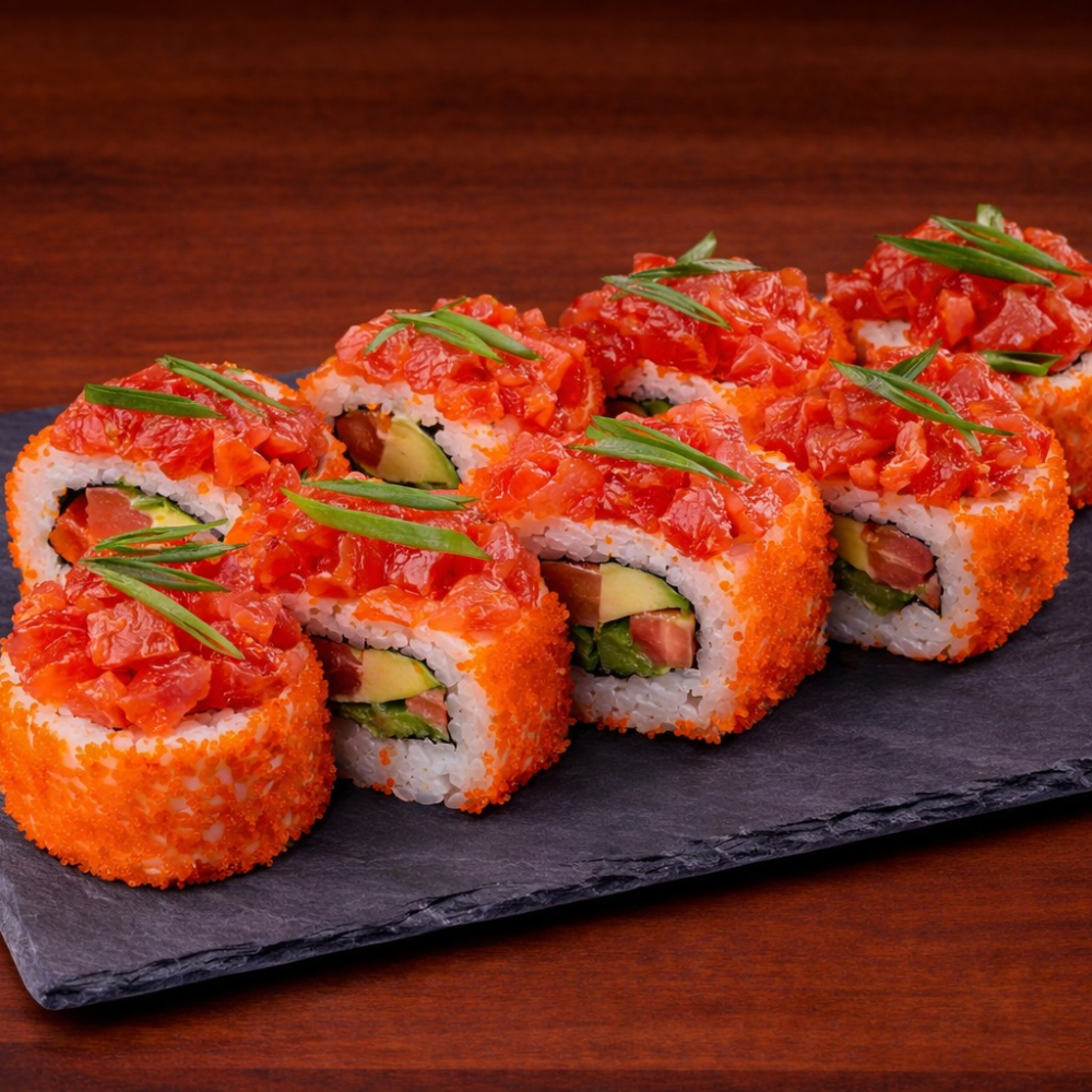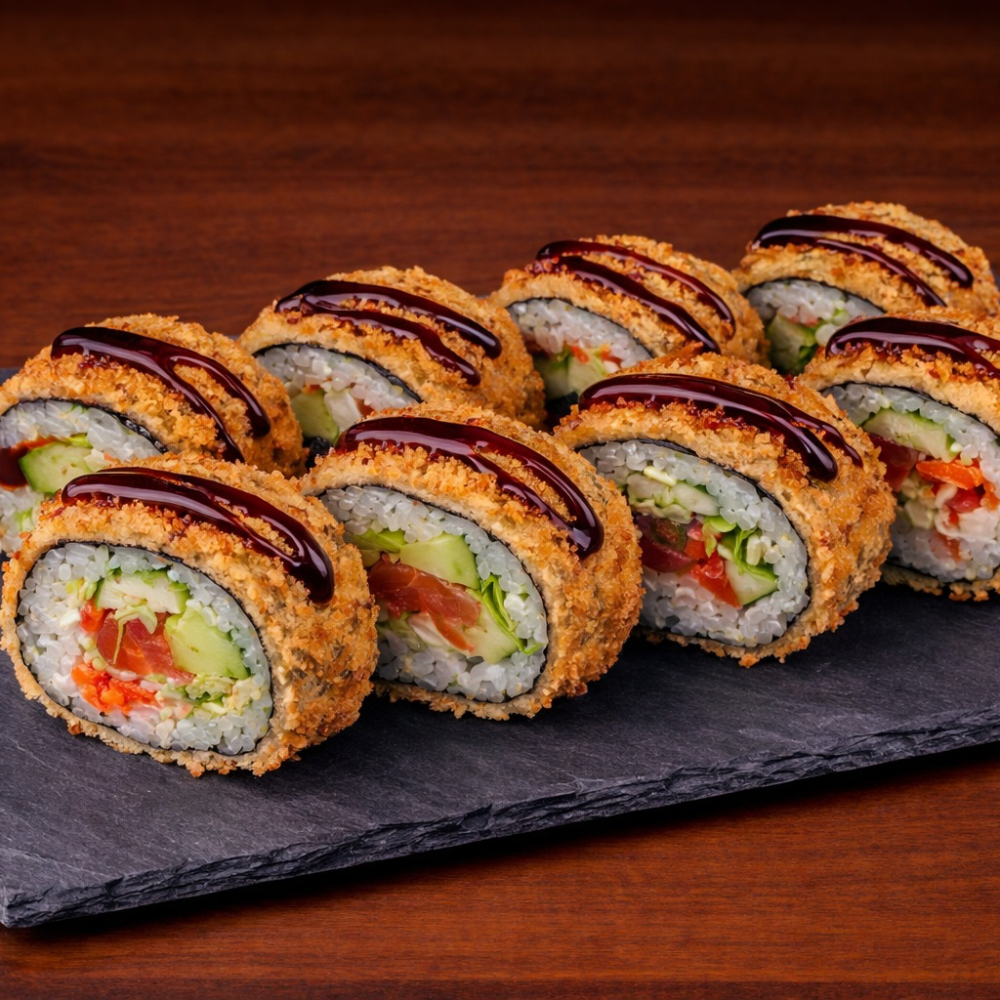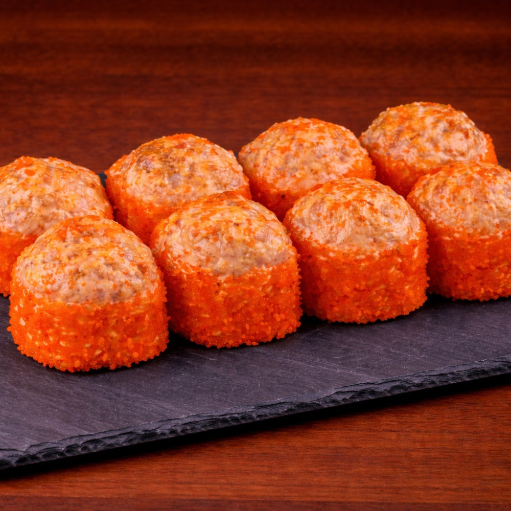 Ролл Королевский дракон с крабом — это изысканное сочетание нежного копчёного угря, краба сурими и кремового творожного сыра с хрустящим огурцом на плотном рисовом основании, обёрнутом нори. Сверху — икра масаго, ароматный соус унаги и соус яки, лёгкая посыпка кунжутом. Создаёт насыщенный, сбалансированный вкус с приятной сладко-солёной гармонией и богатой текстурой. Идеальный выбор для ценителей премиальных, многослойных роллов.