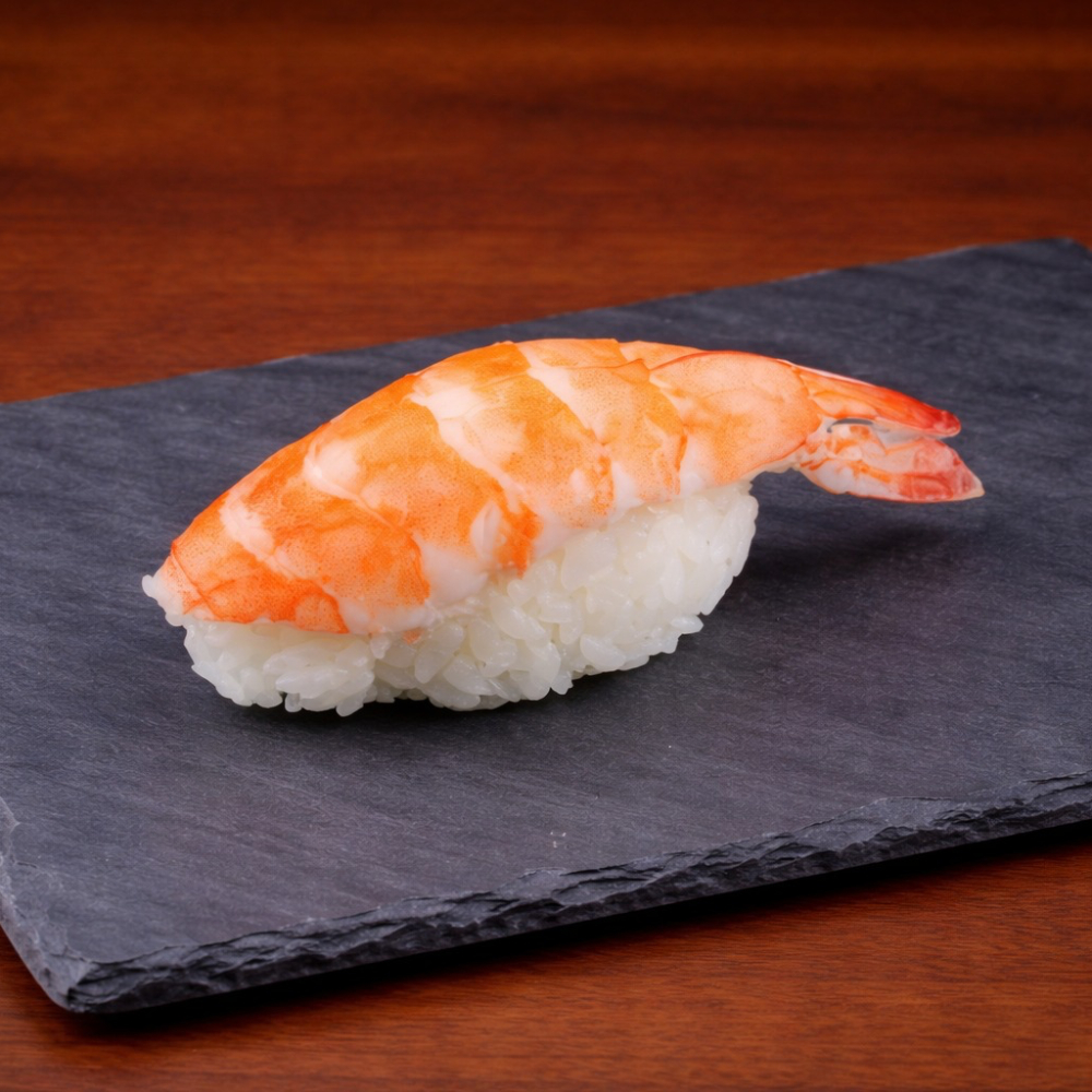 Суши с креветками — это классическое нигири: сочная, упругая креветка премиум-класса аккуратно уложена на плотный рисовый шарик, слегка приправленный рисовым уксусом. Нежный морской вкус и лёгкая сладость риса создают утончённое, сбалансированное и элегантное сочетание, подчёркивающее чистоту и гармонию традиционной японской кухни.